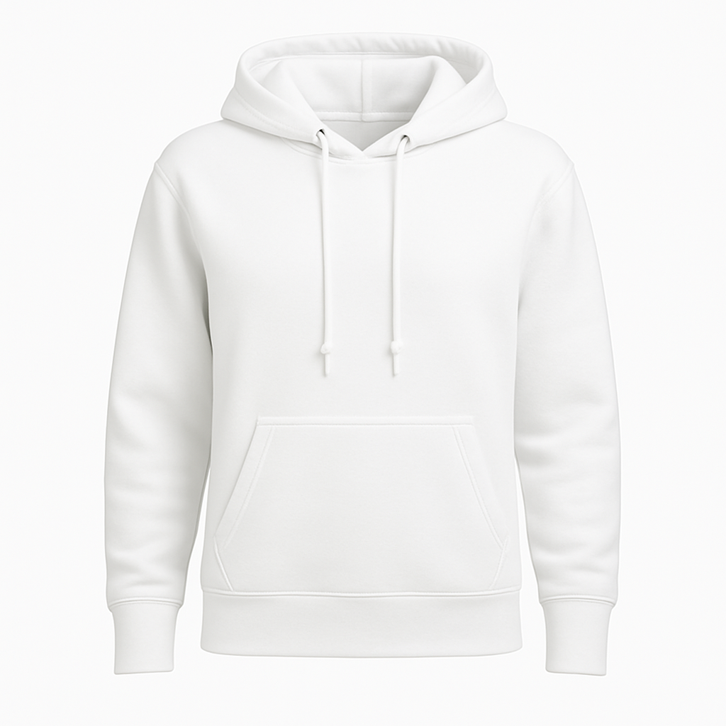 Męska bluza z kapturem do nadruku Velvoria Core Hoodie – biała to klasyczna bluza kangurka z miękkiej, jasnej dzianiny dresowej. Biały kolor gwarantuje maksymalną czytelność nadruków i dobrze kontrastuje z ciemnym tłem sklepu oraz zdjęć kampanijnych.